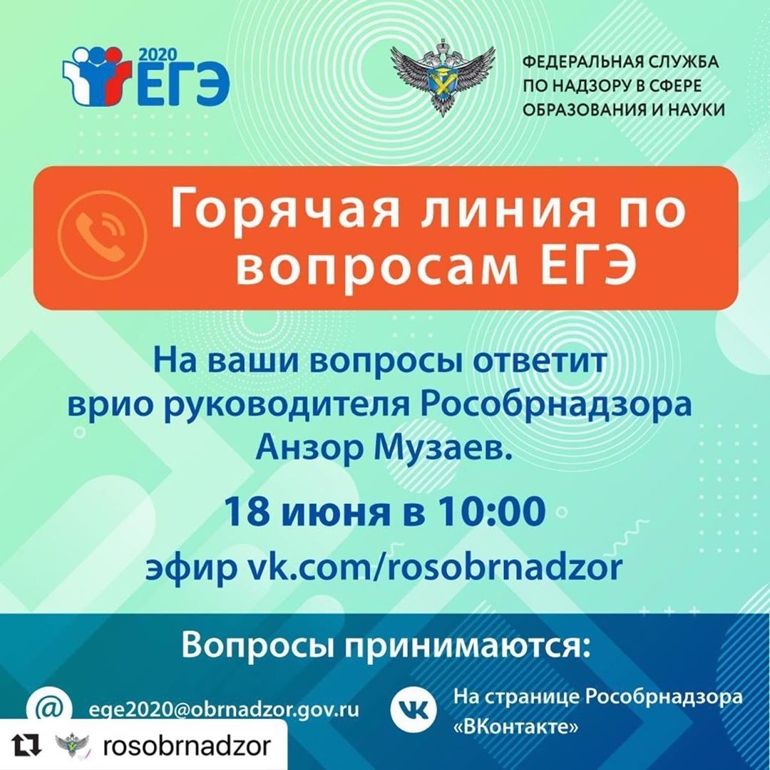 02.06.2020Важно!18 июня в 10:00 состоится горячая линия врио руководителя Рособрнадзора Анзора Музаева по вопросам ЕГЭ-2020 в СИЦ Рособрнадзора.⠀Трансляция пройдёт на странице Рособрнадзора «ВКонтакте».⠀Вопросы принимаются по электронной почте ege2020@obrnadzor.gov.ru, а также в отдельной теме на странице Рособрнадзора «ВКонтакте»