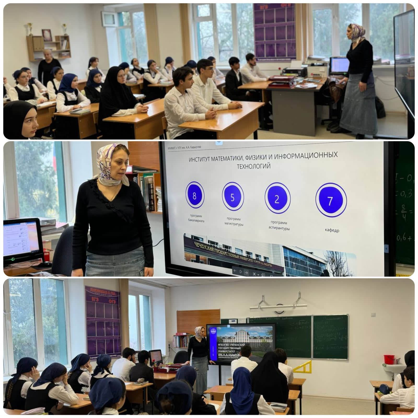 Маднат Магомедовна рассказала учащимся о возможностях обучения в Чеченском государственном университете, о востребованных направлениях в области физики, математики и IT, а также поделилась своим опытом работы в научно-образовательной сфере.